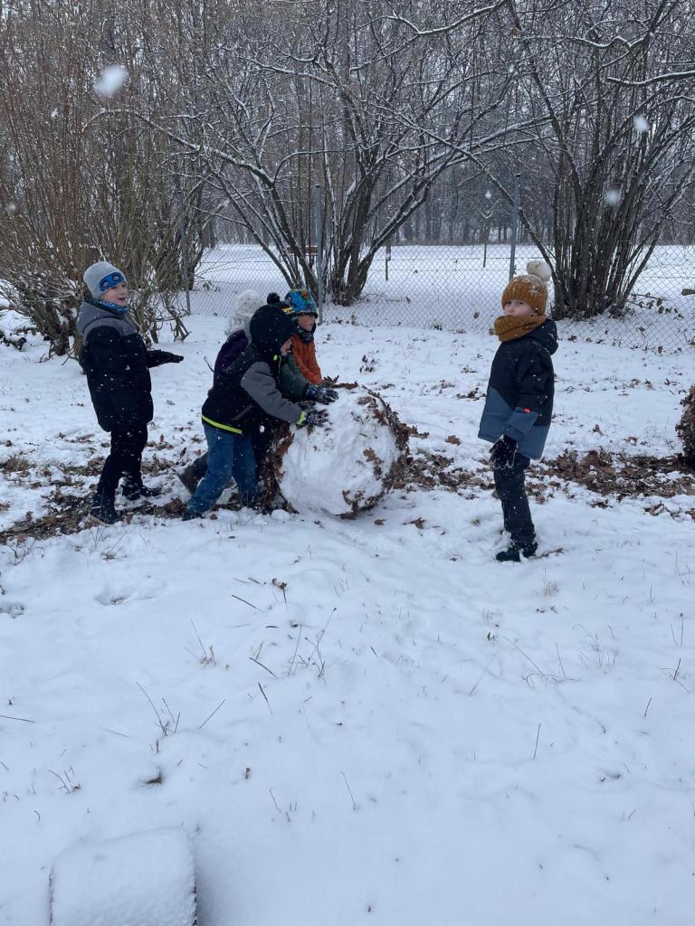 Děti si se sněhem s nadšením hrály, koulovaly se a společně postavily krásného sněhuláka.