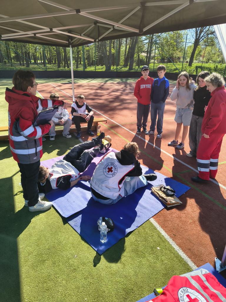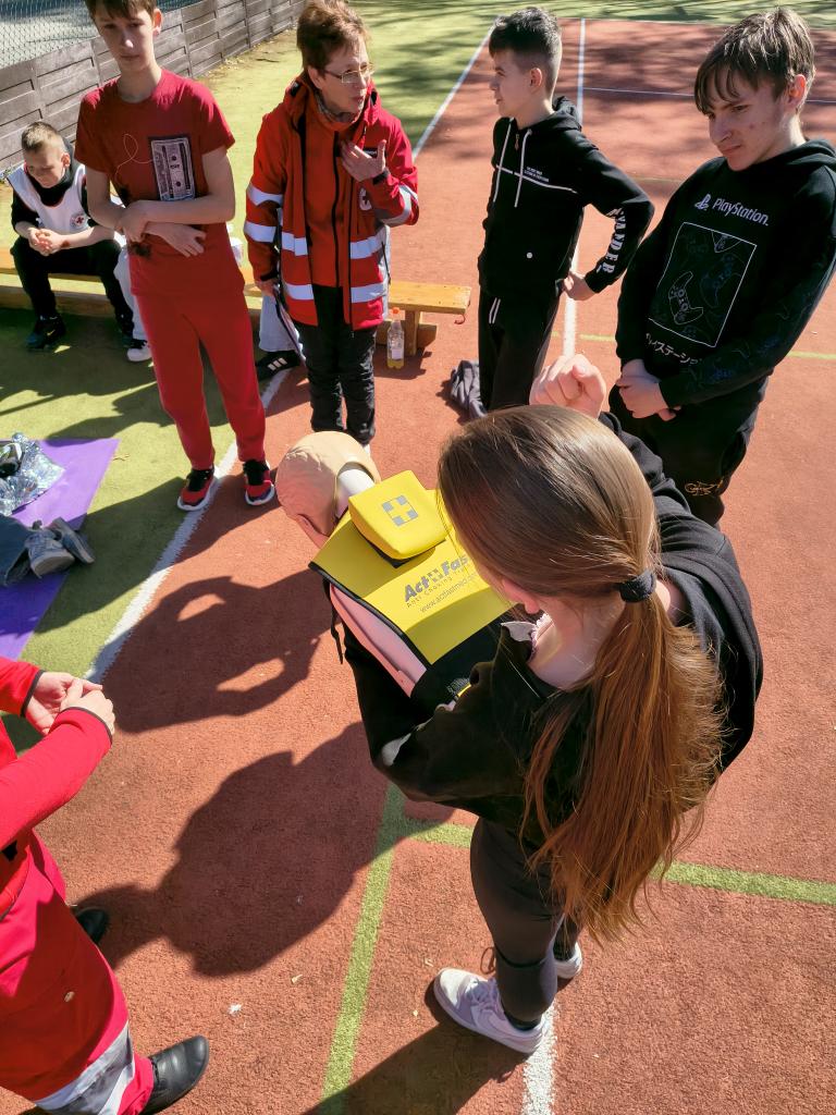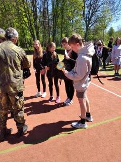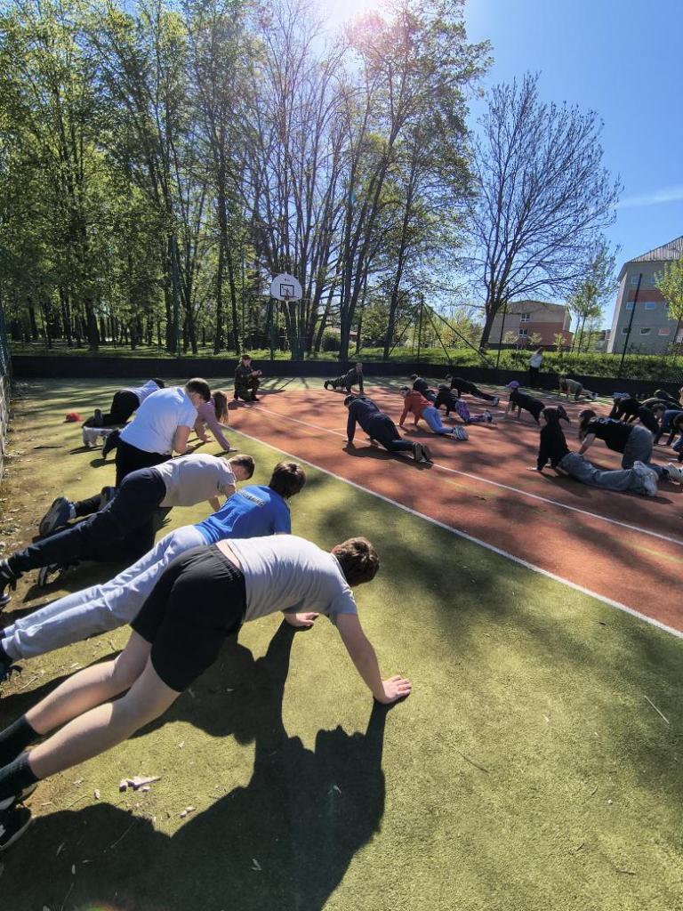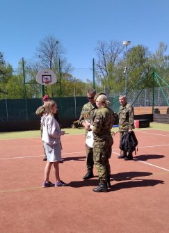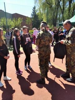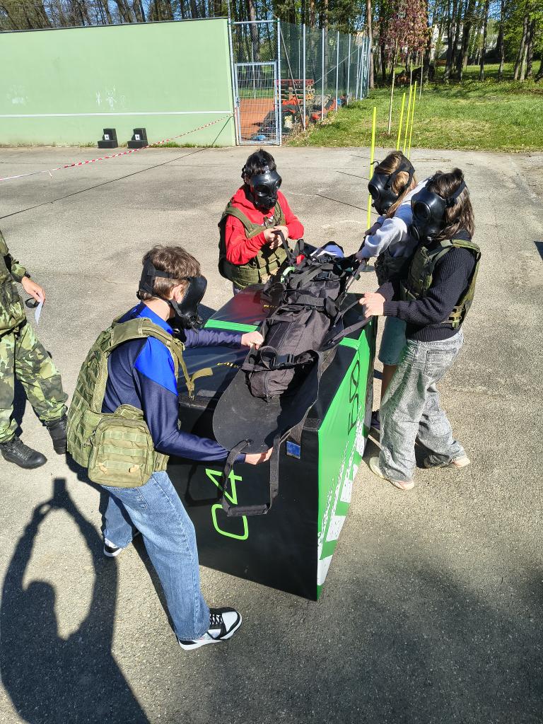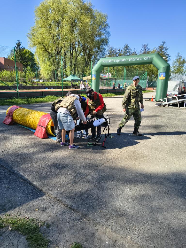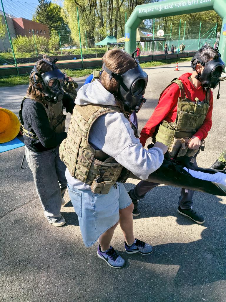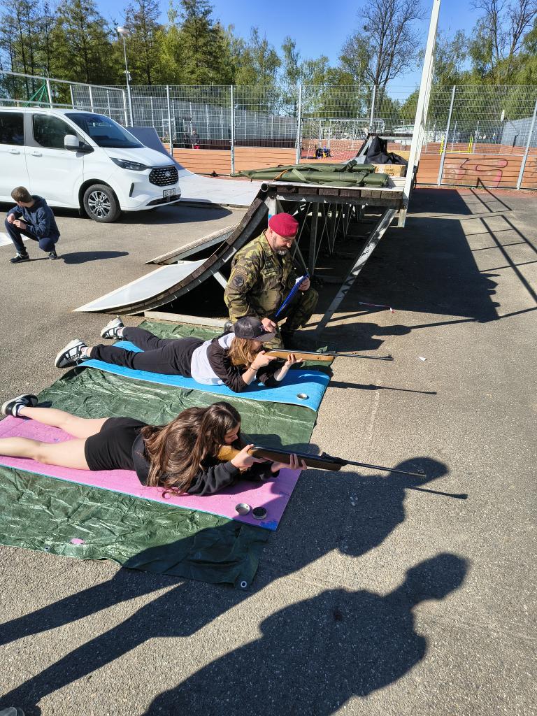 Dopolední trénink, jak umím základy první pomoci, jaká je mohe zdatnost, jak zvládnu přenést zraněnou osobu do bezpečí přes překážky, jak umím střílet na terč a další. Děkujeme Armádě ČR a Červenému kříži, že nám připravil tento den.